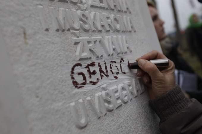 Kada su vlasti uklonile riječ „GENOCID“, Bakira nije ustuknula. Izvadila je karmin i crvenim slovima ponovo ispisala riječ koja ih progoni – „GENOCID“